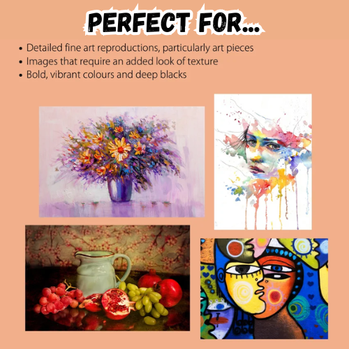 A luxurious fine art inkjet paper features a heavily textured surface and a natural white base.